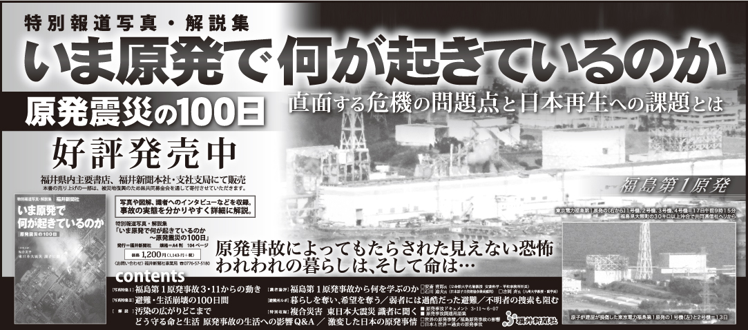 福井新聞社は、東京電力福島第1原発事故の発生後約100日間を追った特別報道写真・解説集「いま原発で何が起きているのか 原発震災の100日」を発売しています。深刻な事態が続く同原発の現状や事故拡大の過程、大きな不安をもたらしている放射能汚染の実態などを、多くの写真と図表を盛り込んで分かりやすく伝えています。